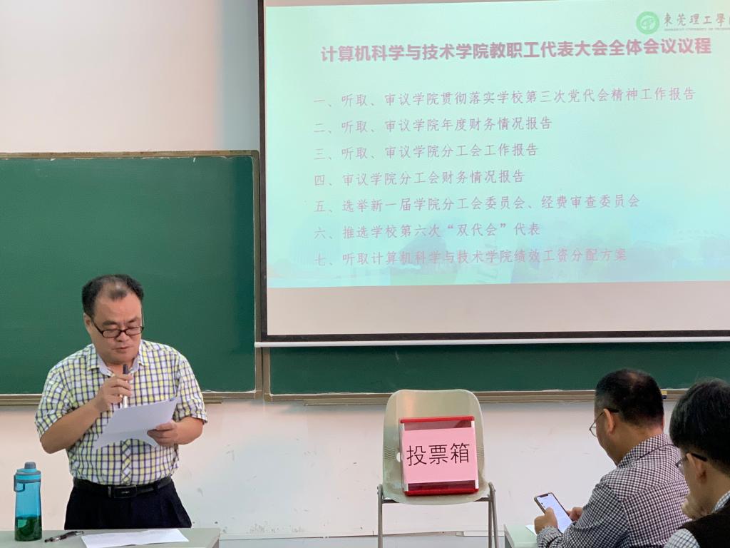 11月28日下午,计算机科学与技术学院在6D103召开教职工代表大会,听取审议学院发展报告和财务报告,工会工作报告和经费开支报告,选举产生工会主席和委员,推选学校“双代会”代表,圆满完成各项议程,充分发挥教代会参政议政、民主管理功能。学院领导班子成员袁华强、路晓军、魏文红、刘群锋等和全体代表出席大会。