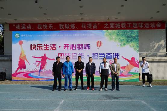 学校工会专职副主席吕卫东,莞城校区党工委书记、管委会常务副主任刘健,莞城校区工联会主席潘荣新,sunbet申博书记杜应发,粤台学院院长陈伟,中法学院院长陈毅华等作为领导嘉宾前来出席趣味运动会的开幕式,并带领全体参赛教职员工做热身体操。