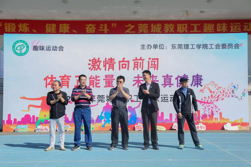 莞城校区党工委书记、管委会常务副主任刘健,莞城校区工联会主席潘荣新,经管学院书记杨继学,粤台学院院长陈伟,继续教育学院院长刘伟等作为领导嘉宾前来出席趣味运动会的开幕式。刘健鸣响汽笛并宣布趣味运动会开幕,主持人带领全体参赛教职员工做热身体操。