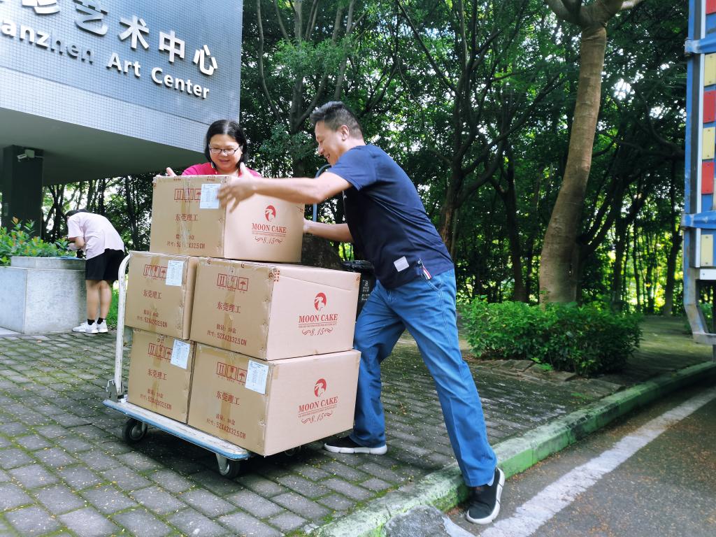 为方便大家领取,吕卫东、邹胜美分别带领校工会办公室工作人员,兵分两路,把月饼送至两个校区20多个接收点。有现场就领到月饼的老师表示,近几年都能收到具有莞工元素的月饼,特别有归属感和认同感,希望学校和工会能把这个这么好的活动一直延续下去。