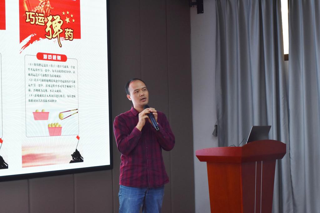 学院党委副书记、分工会主席黄湘介绍了活动内容、趣味运动会的项目规则,指出本次室内趣味运动会采取“党史+趣味运动”的创新模式,以“学党史,感恩党,跟党走”为主题,分设重走长征路、奋勇杀敌、冲锋陷阵、巧运弹药以及丰收南泥湾5个趣味项目,希望老师们寓教于乐,在轻松活泼的氛围中掌握和领会党史知识。