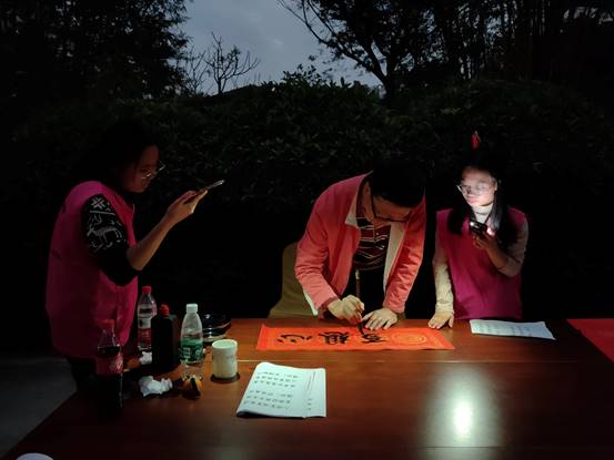 由于大家热情十分高涨,原定17:00结束的活动,一直持续到晚上18:45,整个活动花了将近5个小时时间。校书画协会会长杨万江老师全程参与,在天色暗下来后,仍然在手机微弱的灯光下,写好最后一位老师的春联方才离开。杨万江会长表示,只要大家喜欢,每年都举办现场挥毫写春联送春联活动。
