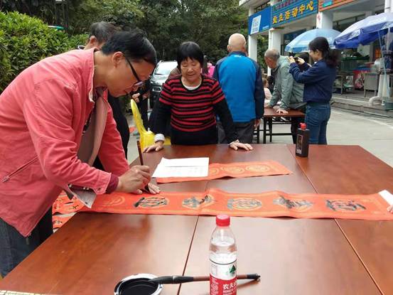 校教职工书画协会的杨万江、杨继龙、宋跃、莫振轩四位老师,现场挥毫,为现场300多个教师村住户现场书写春联。现场拿到春联的老师,个个喜笑颜开。在朋友圈见到现场写春联火热场面的老师,也纷纷打电话、发微信请求在校的老师帮忙,请现场的四位老师书写春联。