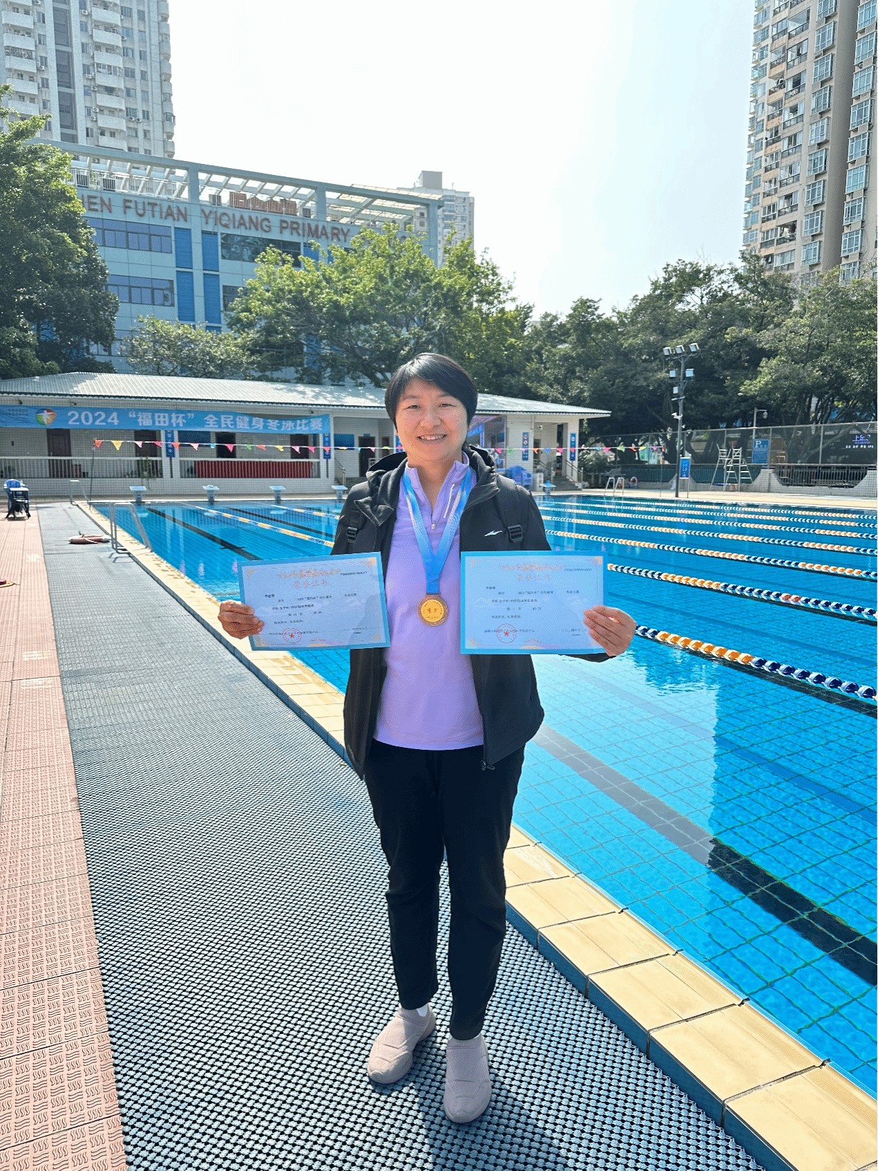 经过激烈的争夺,我校教师李丽珊获得女子40-49岁组50米自由泳第三名、50米蛙泳第四名;徐剑晖获得男子40-49岁组100米自由泳第六名。