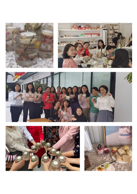 活动中法社巾帼们共聚花艺馆,由专业的花艺师讲解如何制作干花香薰蜡烛台,并分享生活美学的心得。女教工们通过选花材、修形状、摆造型、分层施蜡等步骤设计出属于自己的蜡烛杯。每一个成品都体现出女老师们对美的独特诠释,匠心独具。手工作品完成后,大家坐着品茗畅谈,活动在欢乐的氛围中落幕。