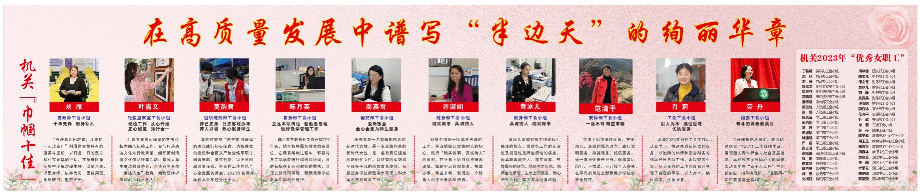 同时,为了激励女职工奋进新征程、建功新时代,继续创先争优,彰显卓越,进一步激发机关全体女职工自尊、自信、自立、自强的精神,机关党委和机关分工会开展了“优秀女职工”与“巾帼十佳”评选活动。经过推荐、审核、投票评选、公示等环节,最终遴选出33位“机关优秀女职工”和10位“机关巾帼十佳”。通过榜样的力量,激励和引导机关全体女职工以昂扬的姿态,在推动学校事业高质量跃升发展中建功立业,在家庭家教家风建设中发挥独特作用,在立德树人事业中赢得出彩人生,谱写“半边天”更加绚丽的华章,以实干实绩为教育强国建设和民族复兴伟业贡献莞工巾帼智慧和力量。